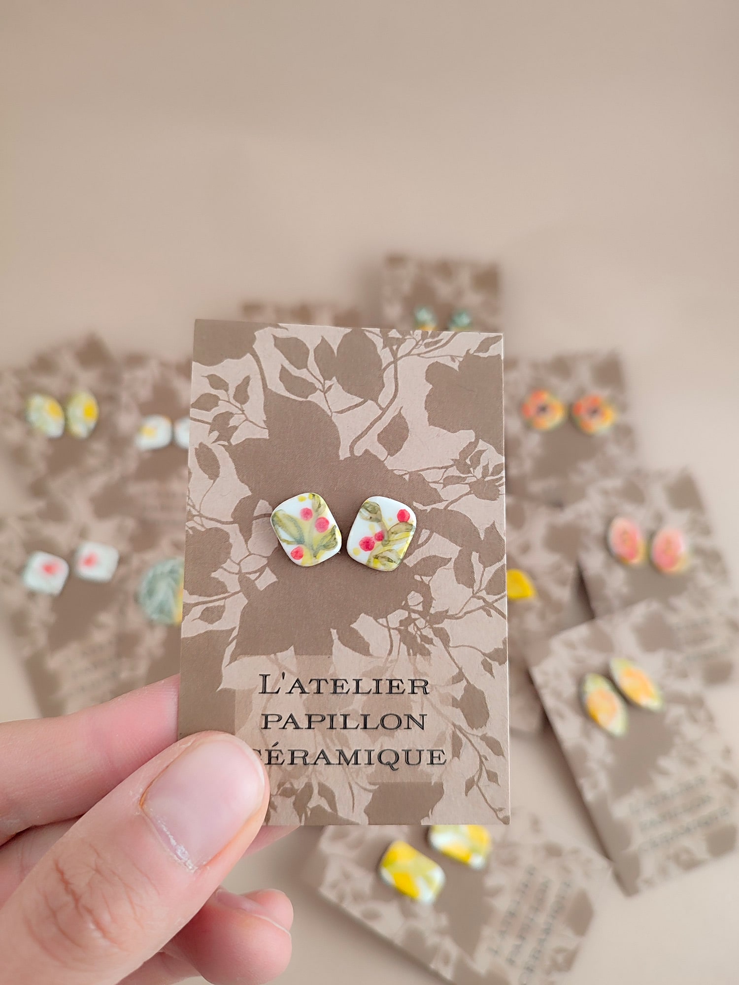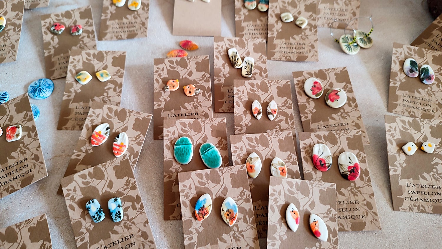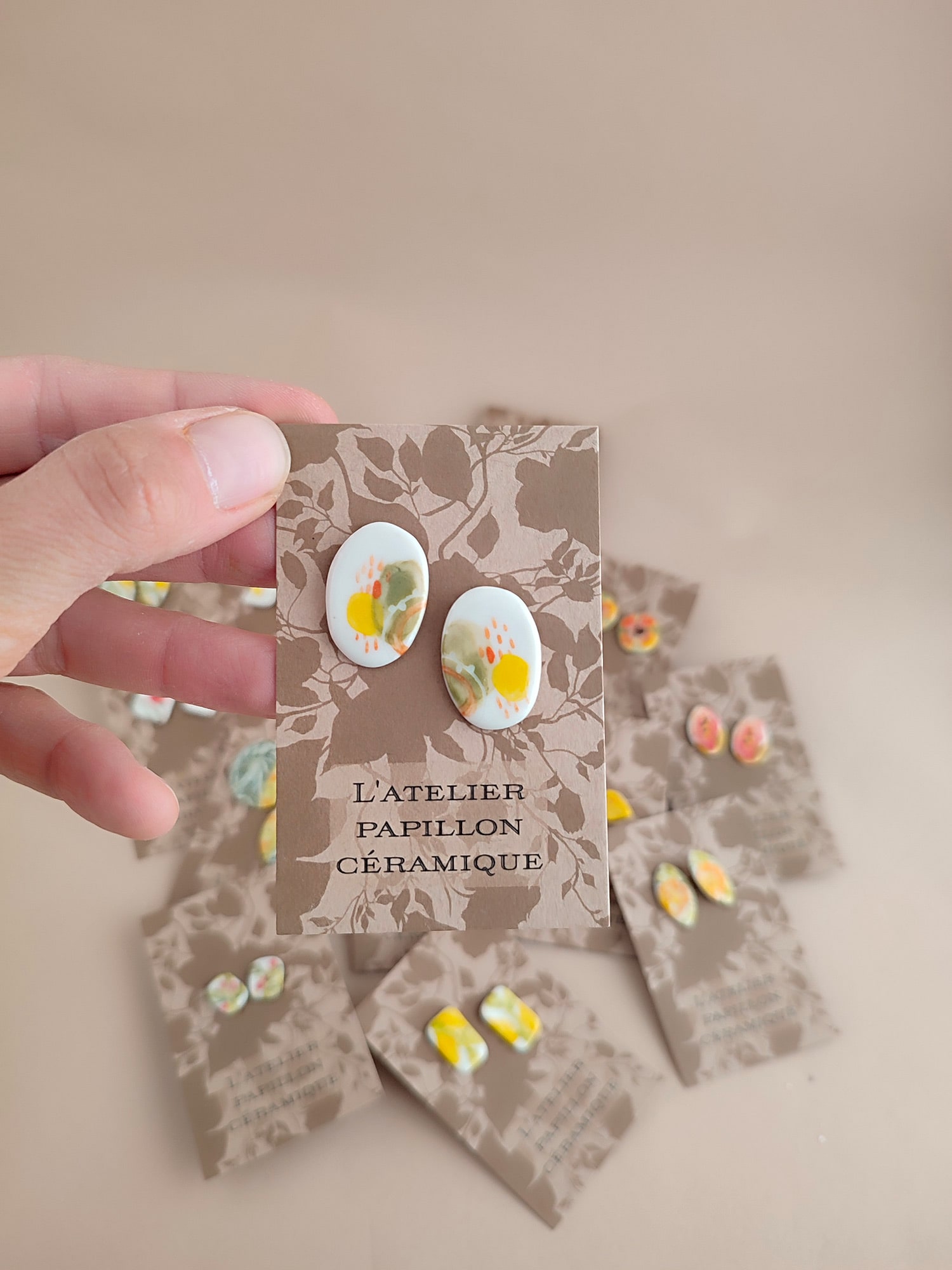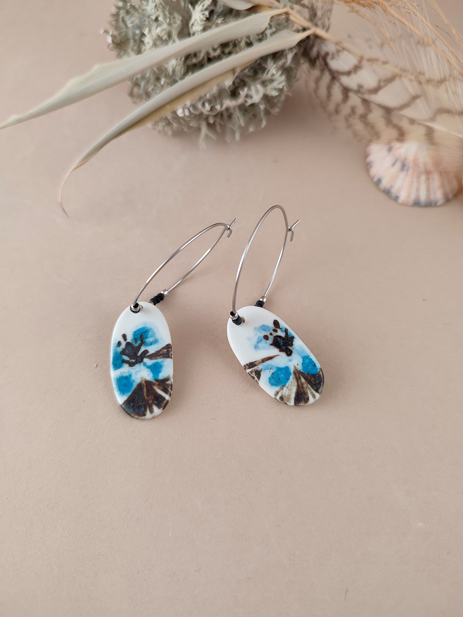 Toutes les boucles sont en porcelaine de Limoges et les apprêts en laiton ou acier inoxydable.
