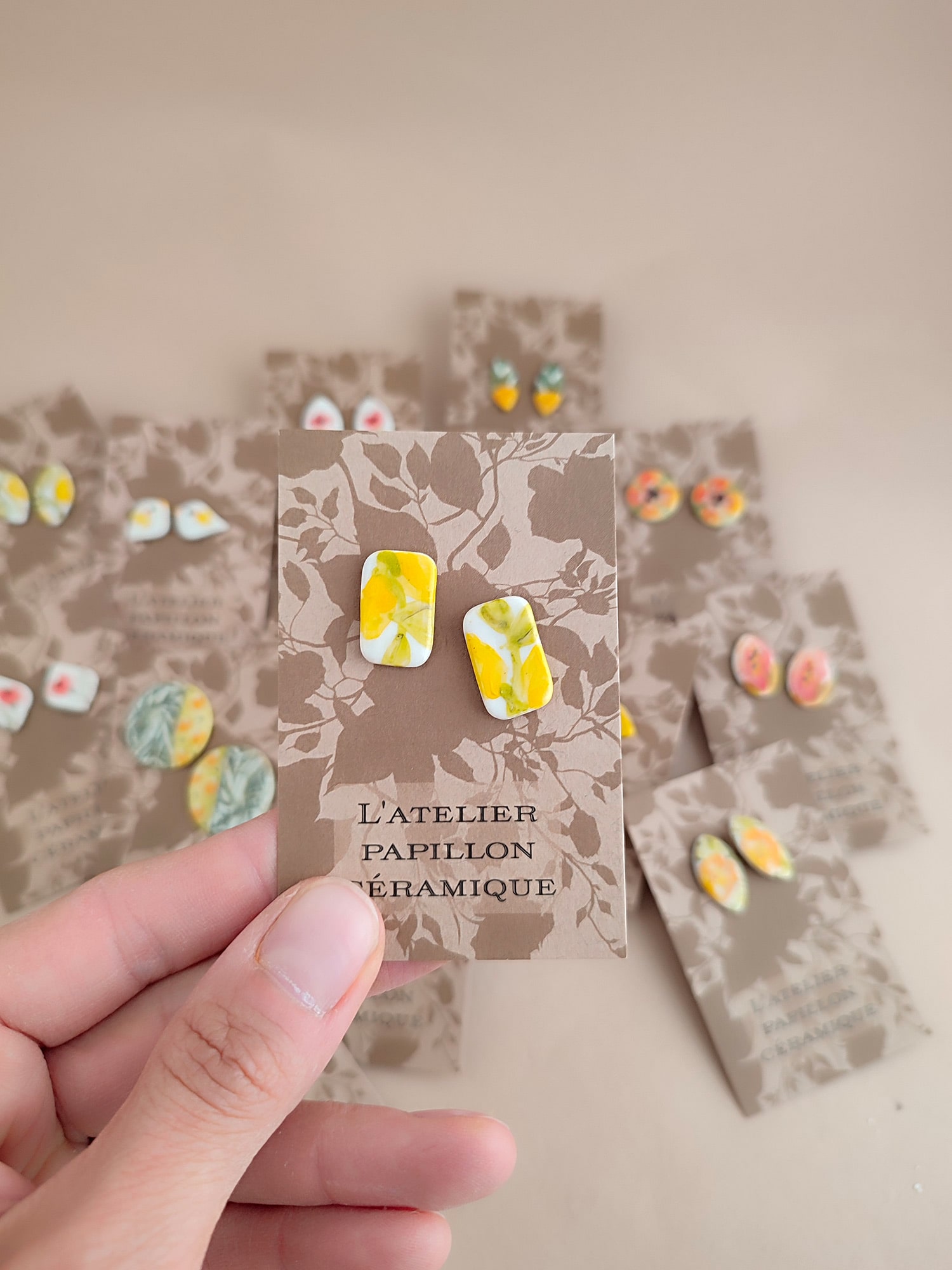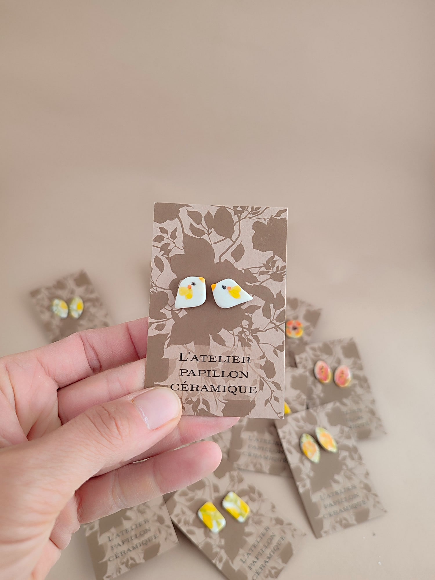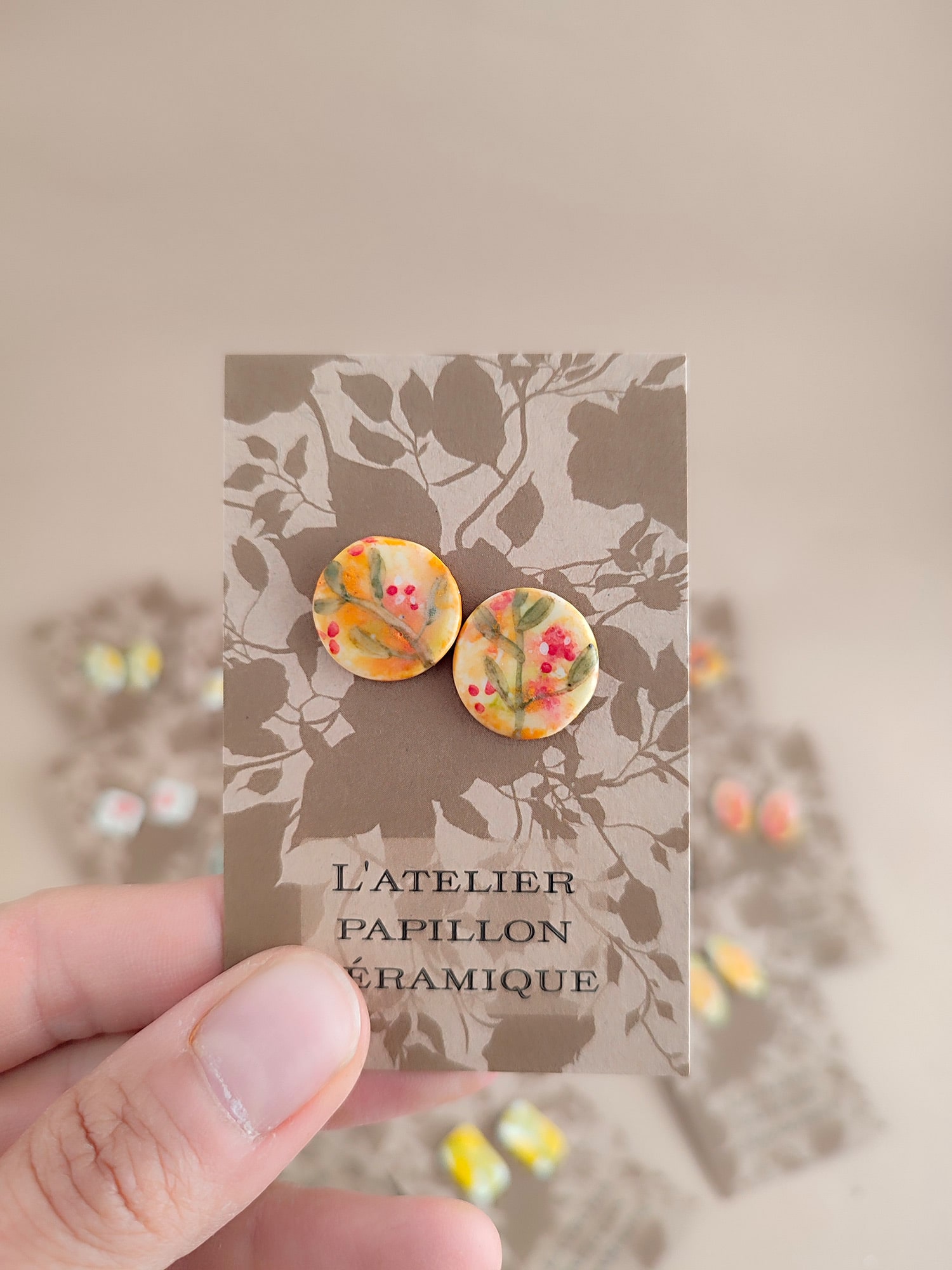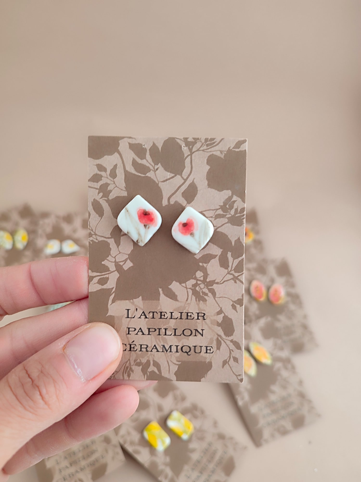 Toutes les boucles sont en porcelaine de Limoges et les apprêts en laiton ou acier inoxydable.